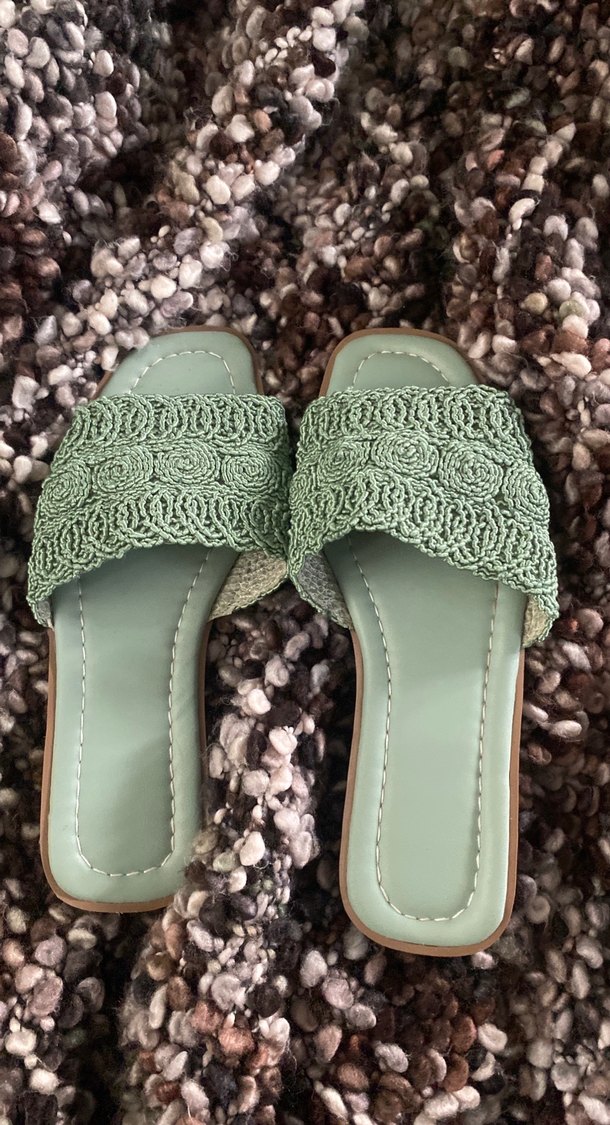 Yeşil renkli, dantel detaylı ve işlemeli örgü kadın terlik. Dolgu topuklu, bohem tarz için uygun, günlük kullanıma ideal.