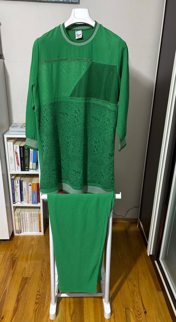 Uzun, yeşil, dantel detaylı, bol kesim tunik. Uzun kollu, yuvarlak yaka ve yumuşak sentetik kumaştan üretilmiştir. Ayrobin kumaş takım
