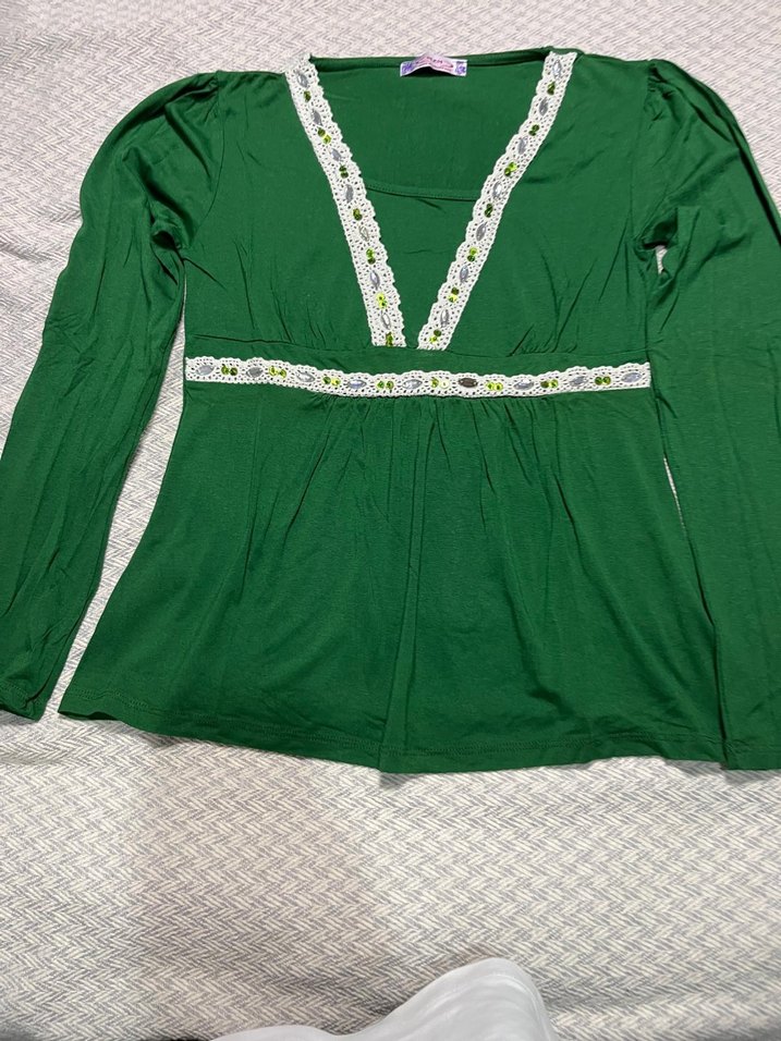Yeşil renkte, dantel detaylı V yakalı, uzun kollu ve işlemeli triko kumaştan yapılmış bohem tarzda, günlük kullanıma uygun fitted bluz.