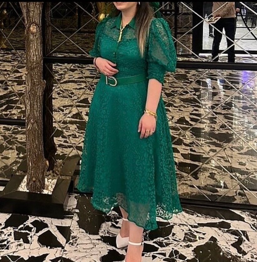 Uzun yeşil abiye elbise, dantel kumaş ve koyu yılan deseni ile. Kayık yaka, askılı kollu ve bol kesim, düğünler için uygun.