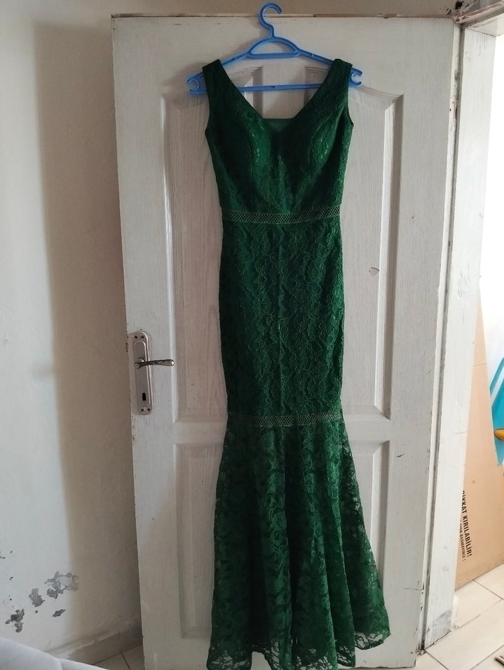 Koyu yeşil, kolsuz, V yakalı ve vücuda oturan dantel kumaşlı uzun abiye elbise, hafif yılan deseniyle. Düğünler için uygun.
