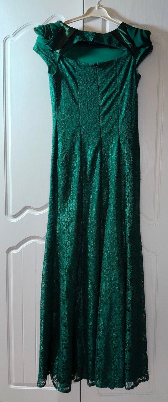 Koyu yeşil renkte, dantel kumaştan, vücuda oturan uzun abiye elbisedir. düğün için uygundur. bir kere giyildi