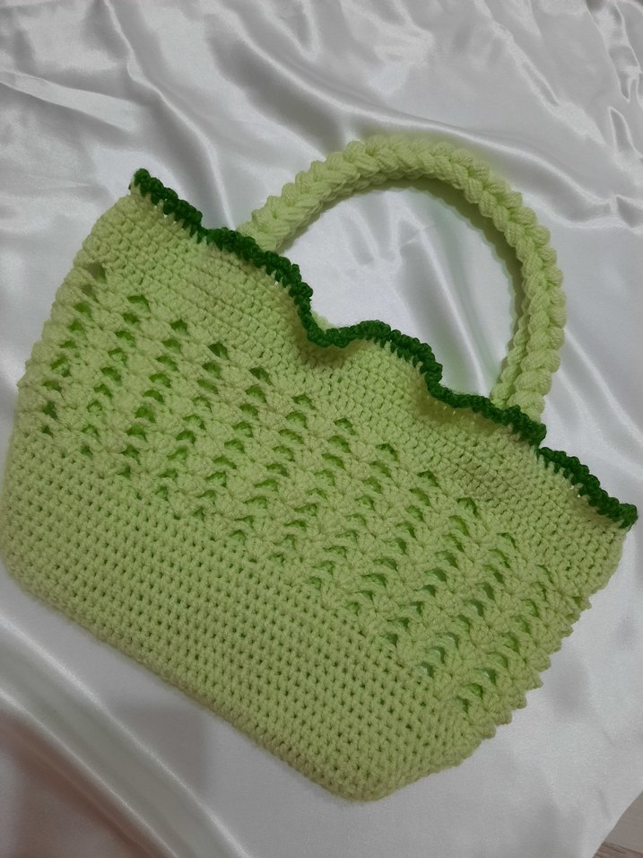 Yeşil renkte, dantelli detaylara ve örgü dokusuna sahip, günlük kullanıma uygun sade ve renkli kadın çantası.