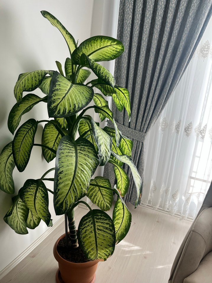 Büyük, çeşitli yeşil yapraklara sahip dekoratif ev bitkisi, kahverengi saksıda sunulur ve iç mekanlara doğal bir dokunuş katar.