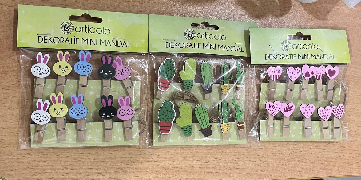 Pastel yeşil renkte, kaktüs desenli dekoratif mini mandal seti. Ev dekorasyonuna sevimli bir dokunuş katar.