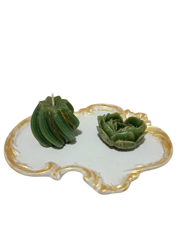 Açık yeşil çiçek ve kabak şeklinde dekoratif mumlar, altın detaylı beyaz bir tepsi üzerinde yer alıyor. ️ Kokulu Mum
