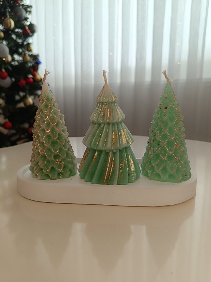 Altın detaylı, açık yeşil renkte, yılbaşı ağacı şeklinde mumlar beyaz bir taban üzerinde.