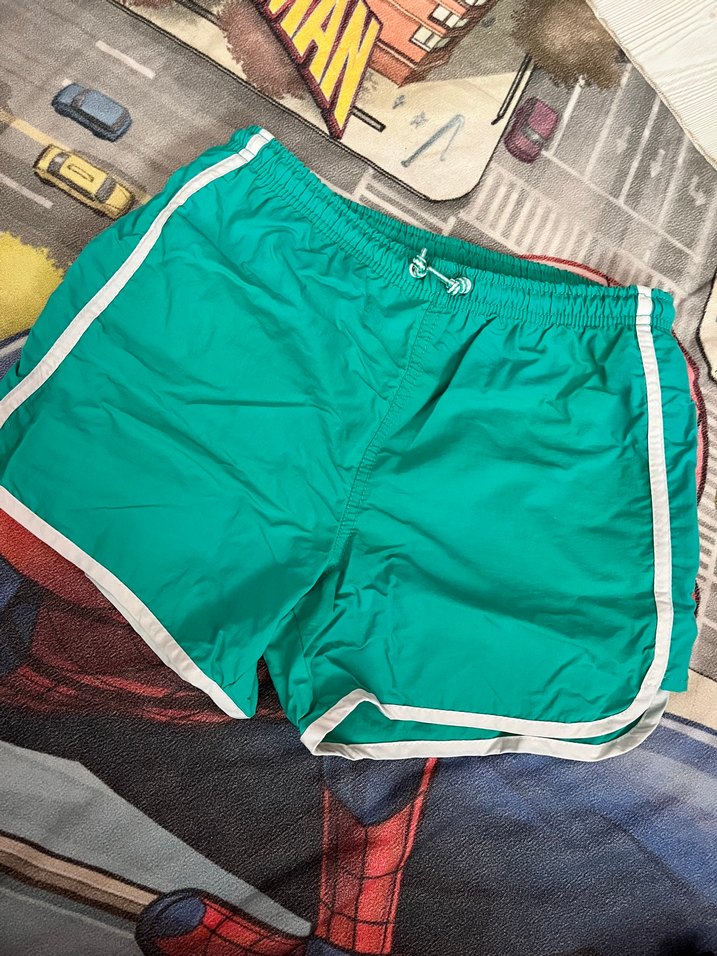 Sentetik kumaştan, beyaz şeritli , bol kesim yeşil deniz şort. ♀️9-10 yaş