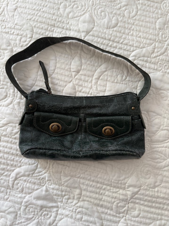 Yeşil deri çanta, önünde tokalı cepler bulunur. Vintage bohem tarzda, günlük kullanıma uygundur.