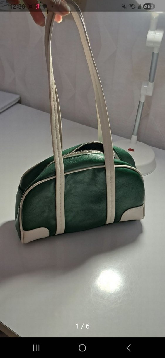 Yeşil deri çanta, fermuarlı üst kısmı ve bej askılarıyla minimalist ve çağdaş tasarıma sahiptir. Günlük kullanım için uygundur. kullanmadım hediye geldi