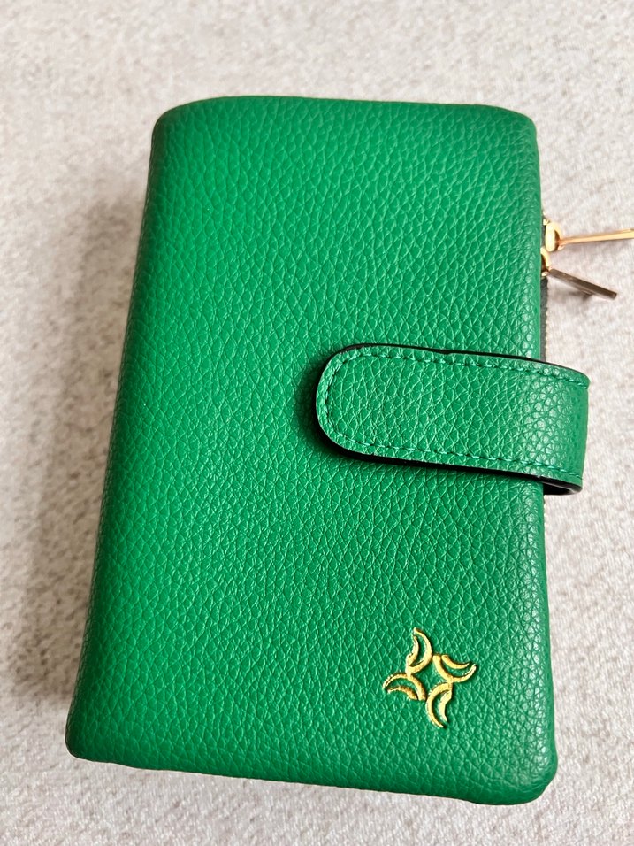 Yeşil deri cüzdan, fermuarlı ve baskılı desenli, parlak yüzeyli, minimal ve bohem tarzda, günlük kullanım için uygun.