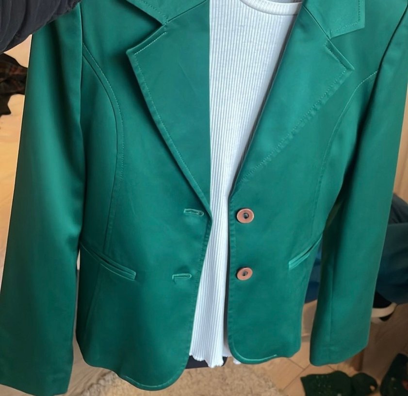 Yeşil deri kadın blazer ceket, kesik yakalı, düğmeli ve uzun kolludur. Normal boy ve regular fit yapısıyla ofis kullanımı için uygundur, parlak çıkmış ama parlak değil görselde öyle görünüyor