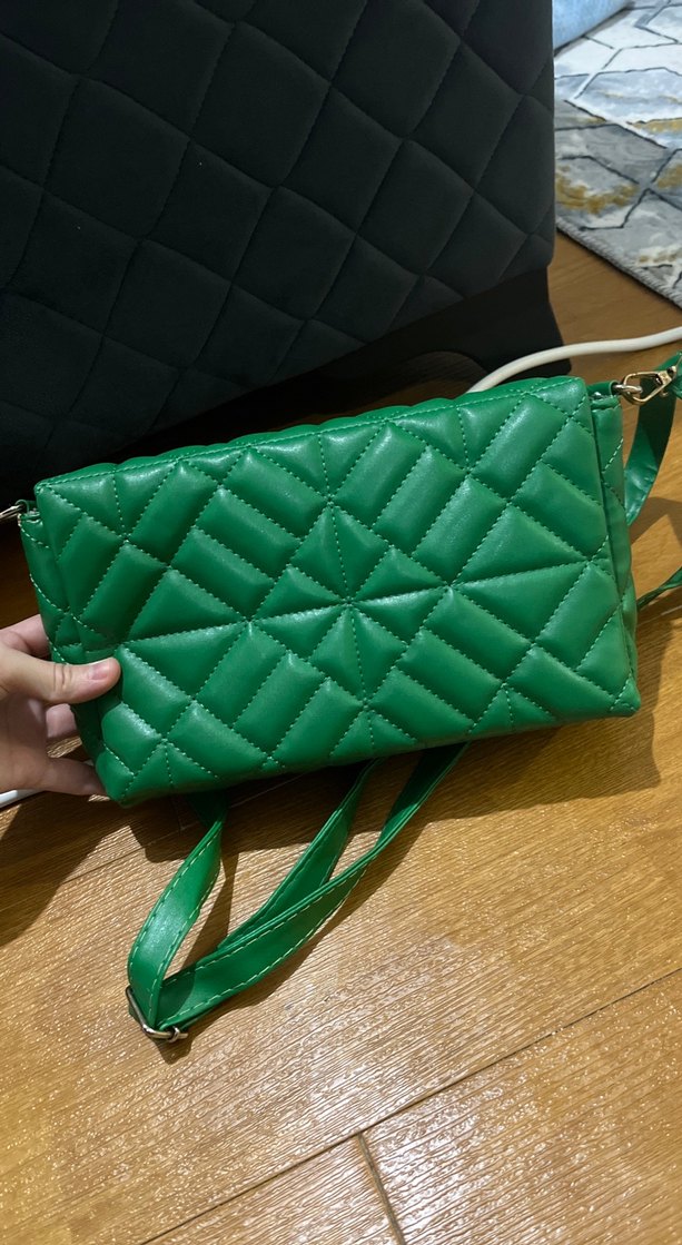Yeşil deri kadın çanta, kapitone dikiş detaylı ve fermuarlı kapamalıdır. Bohem ve retro tarzıyla günlük kullanıma uygundur.