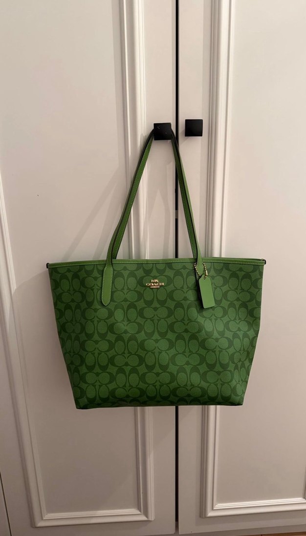 Yeşil deri kadın çanta, baskılı desene ve fermuarlı kapanışa sahip. Klasik zarafet ile çağdaş minimalist tarzı bir arada sunar.