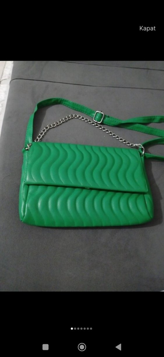 Dalgalı dokulu yeşil deri kadın çanta, fermuarlı kapaklı. Zincir ve ayarlanabilir askı ile sokak tarzına uygun.