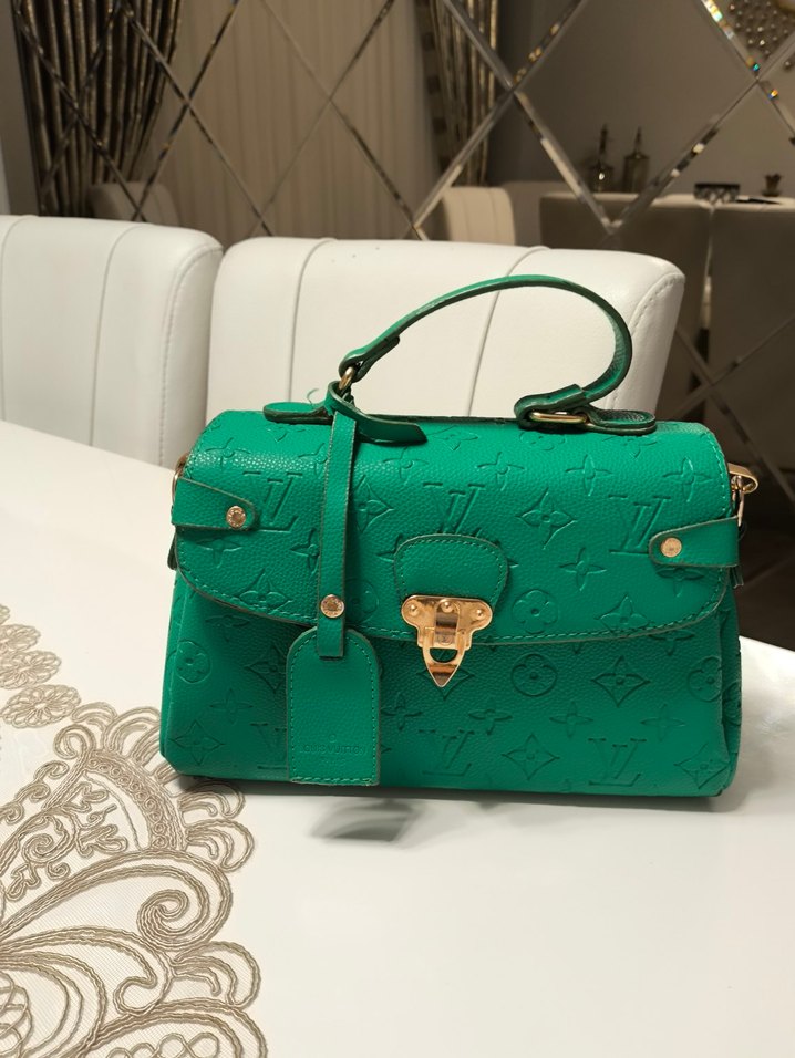 Yeşil deri kadın çanta, tokalı kapanış ve desenli yüzeyle modern klasik ve Paris tarzını yansıtıyor.