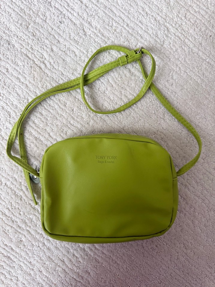 Pastel yeşil deri çapraz çanta, fermuarlı ve sade minimalist tasarıma sahip. Günlük sokak stili için uygun. Önünde TONYYORR yazısı bulunur.