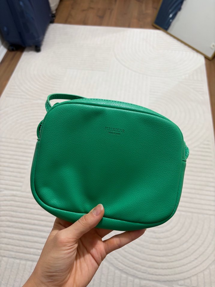 Yeşil deri çapraz çanta, fermuarlı ve minimal tasarımlıdır. Günlük kullanım ve sokak stiline uygundur. Düz ve desensiz yüzeye sahiptir. Hediye gelmiştir hiç kullanılmadı pull bear marka etiketi yok