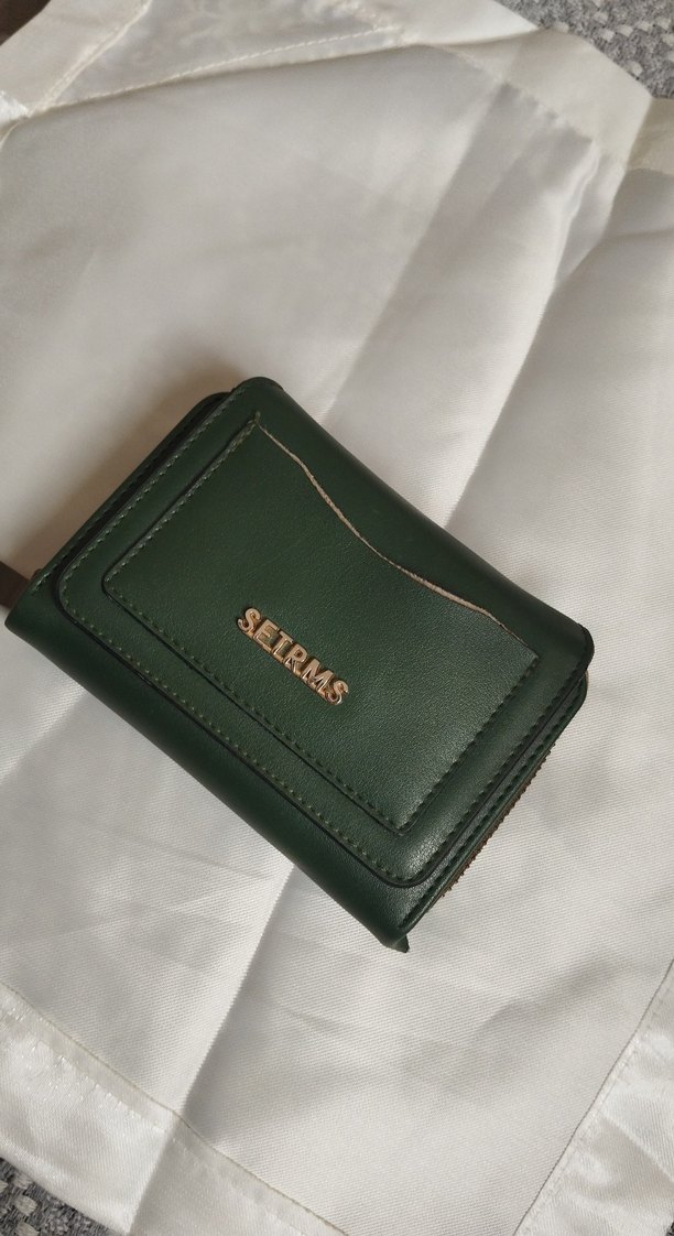 Yeşil deri kadın cüzdanı, tokalı ve baskılı detaylara sahip. SETRMS markalı, parlak yüzeyli ve günlük kullanım için uygun.