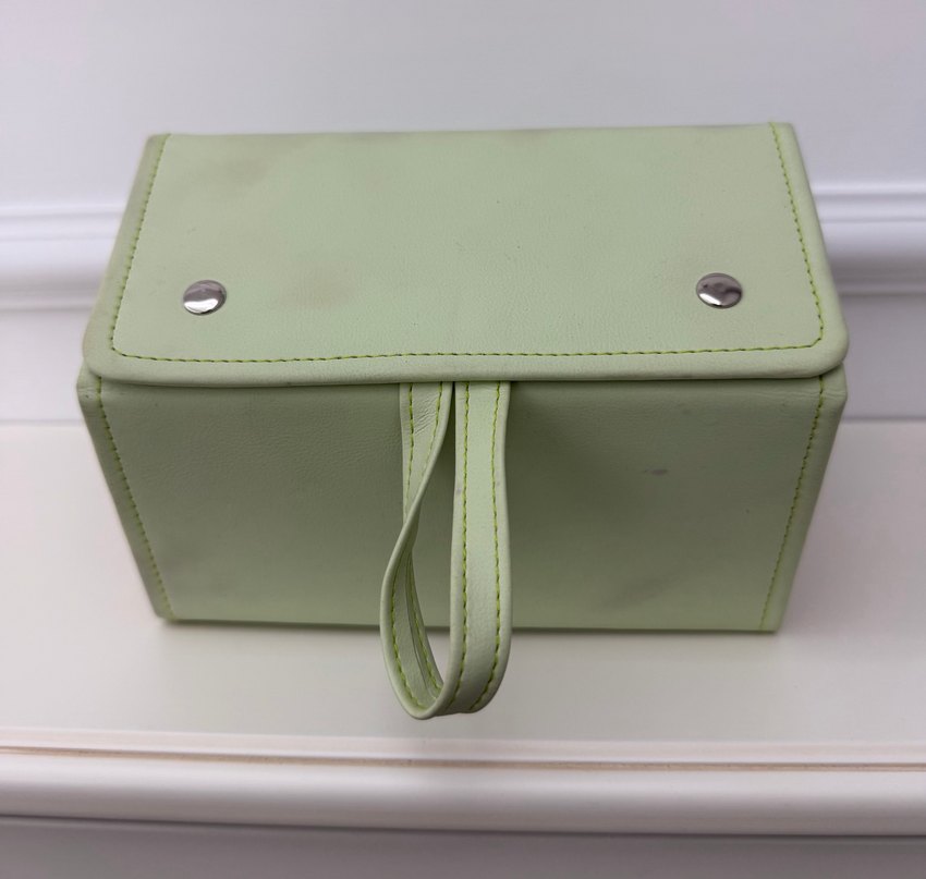 Pastel yeşil deri makyaj çantası, gözlük kutusu fermuarlı kapama ve sade, desen içermeyen minimalist tasarıma sahiptir. Günlük kullanım için uygundur ve kullanışlı bir sapı vardır. Birkaç yerinde leke mevcut