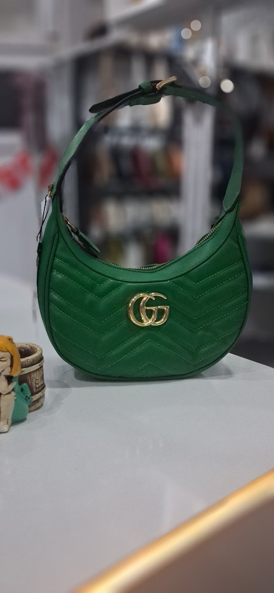 Parlak yeşil deri kadın omuz çantası, tokalı detaylara sahip. Yılan deseni ve altın renkli çift G logosu bulunur, trend sokak stiline uygun.