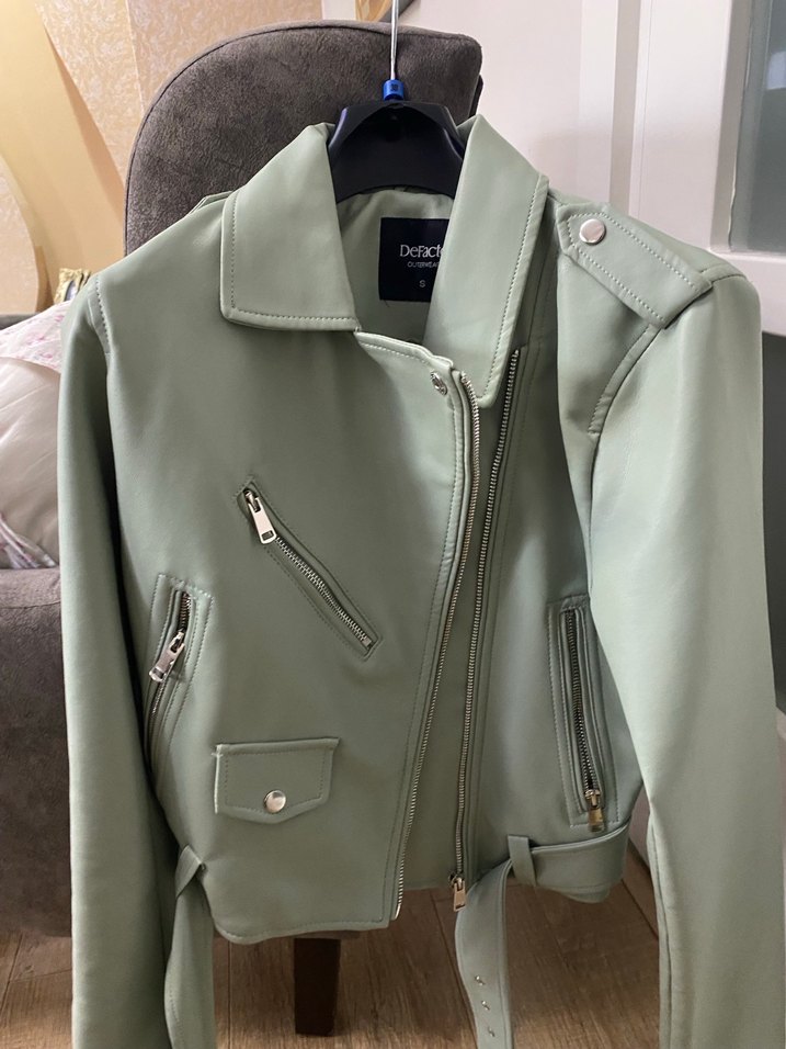 Kemerli, askılı kollu ve kesik yakalı, yeşil deri kısa ceket. Fermuarlı cepleriyle trend sokak stiline uygun, dar kesim.