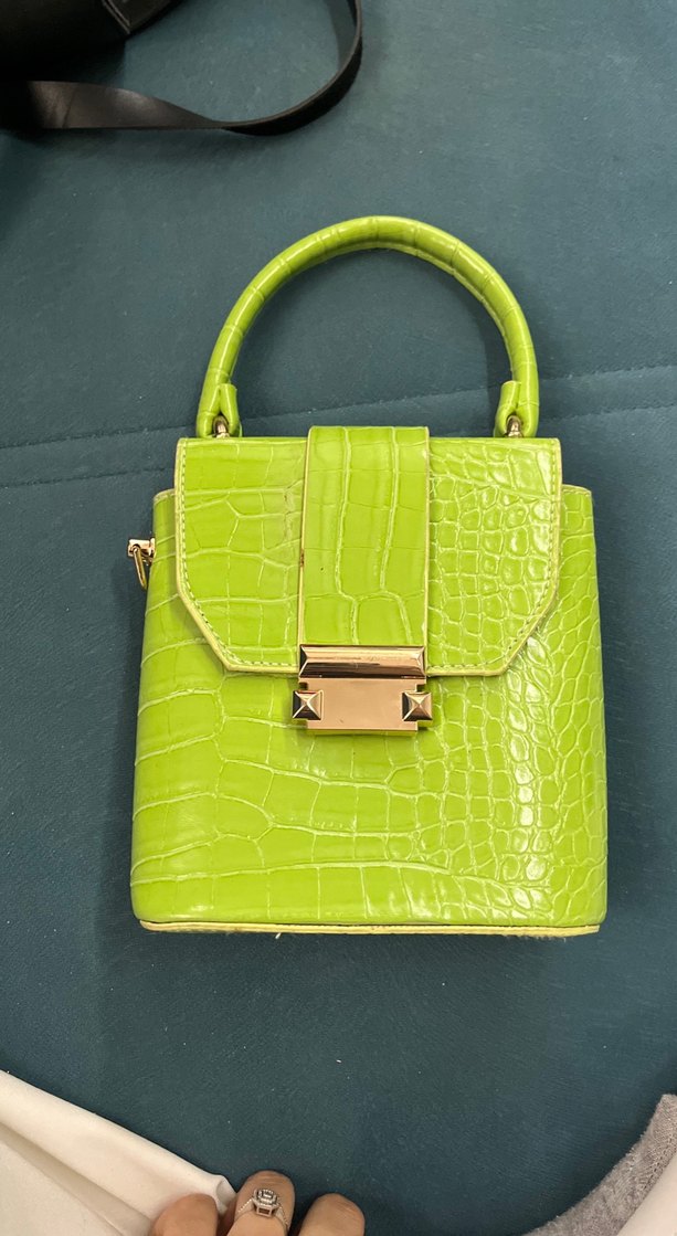 Renkli yeşil deri çanta, krokodil desenli ve tokalı kapamalı. Cesur ve çağdaş tasarımıyla günlük kullanıma uygun, minimalist tarzda.