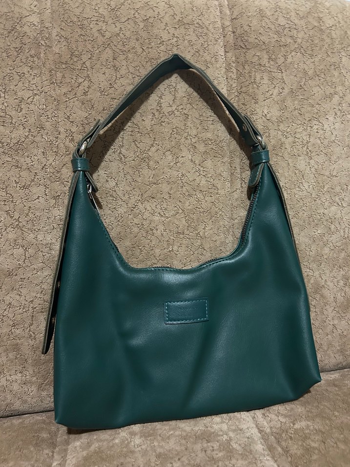 Yeşil deri, tokalı askılı, desen içermeyen kadın çantası. Minimalist tasarımıyla günlük ve sokak modasına uygun.
