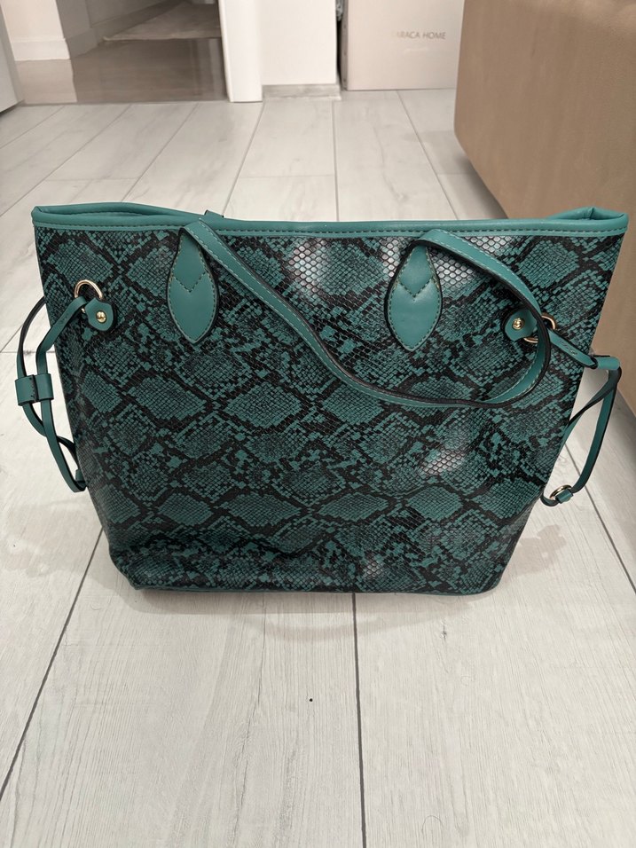 Koyu yeşil deri yılan desenli çanta, zincir detaylı ve çağdaş sokak stilinde. Günlük kullanım için bohem ve retro havası taşıyor. Hiç kullanılmadı eski sezon ELLE ürünü kendi toz torbasıyla saklandı o şekilde gönderilecek hediye gelmişti hiç kullanılmadı.