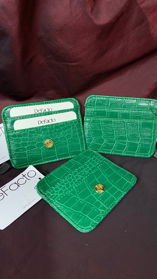 Yeşil deri yılan desenli kadın cüzdanı, fermuarlı ve çoklu kart bölmeleriyle DeFacto markasına ait.