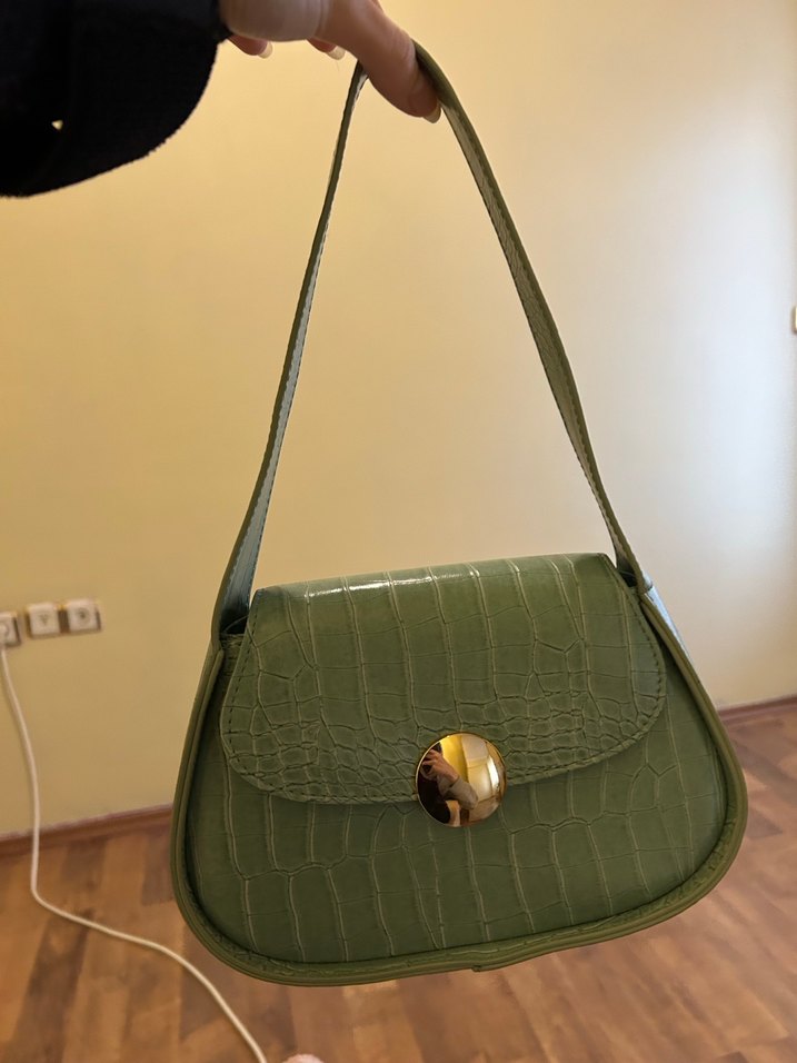 Pastel yeşil yılan desenli deri kadın çanta, tokalı kapaklı, modern klasik ve Paris tarzını yansıtıyor.