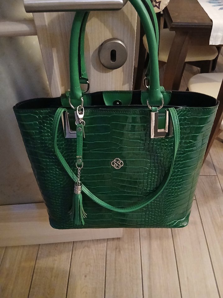 Parlak yeşil deri, yılan desenli ve tokalı detaylara sahip kadın çantası. Günlük kullanıma uygun çağdaş ve klasik şıklık sunar.