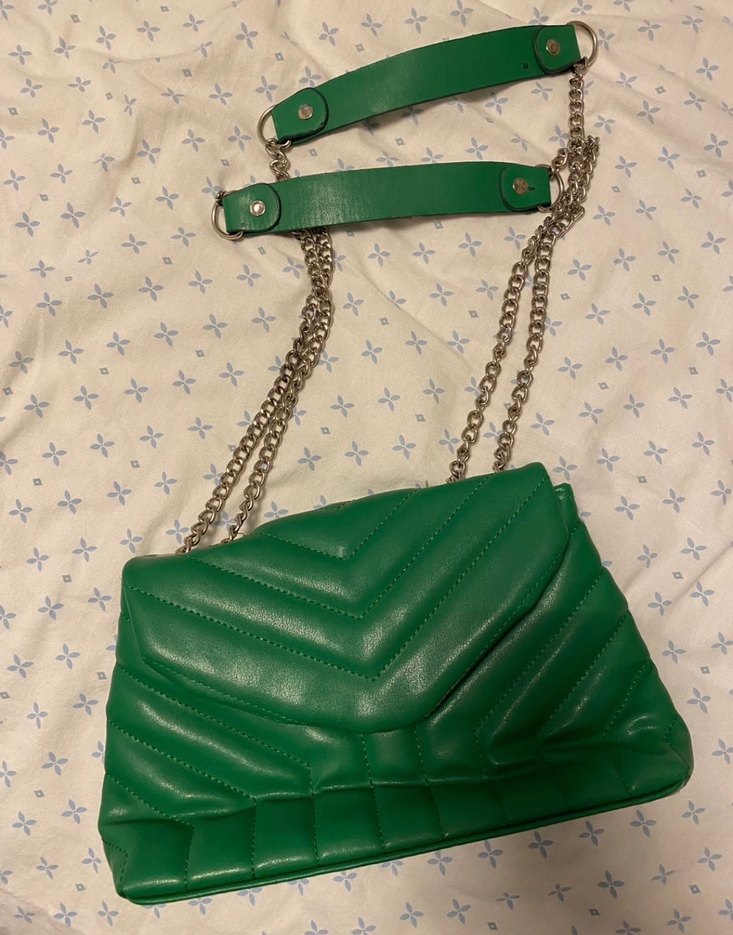 Parlak yılan desenli yeşil deri çanta, zincir detaylı, Paris sokak modası ve bohem-retro tarzını yansıtıyor. Hediye geldi hiç kullanmadım