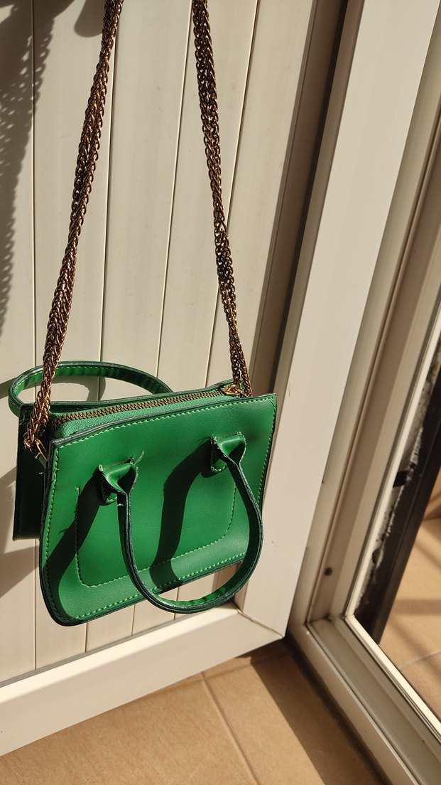 Yeşil deri kadın çanta, ve zincir detaylarıyla trend sokak stiline uygun. zincirde hafif kararma dışında sorunu yoktur