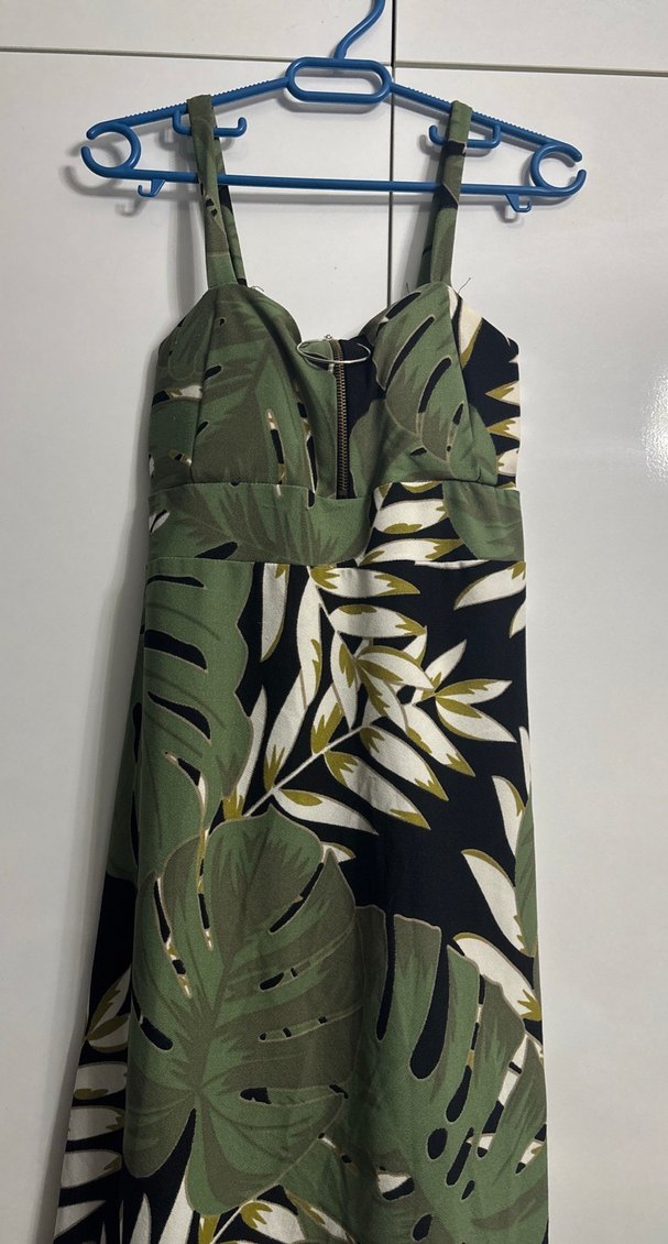 Yeşil ve koyu renkli baskılı, askılı ve fermuarlı, vücuda oturan elbise.