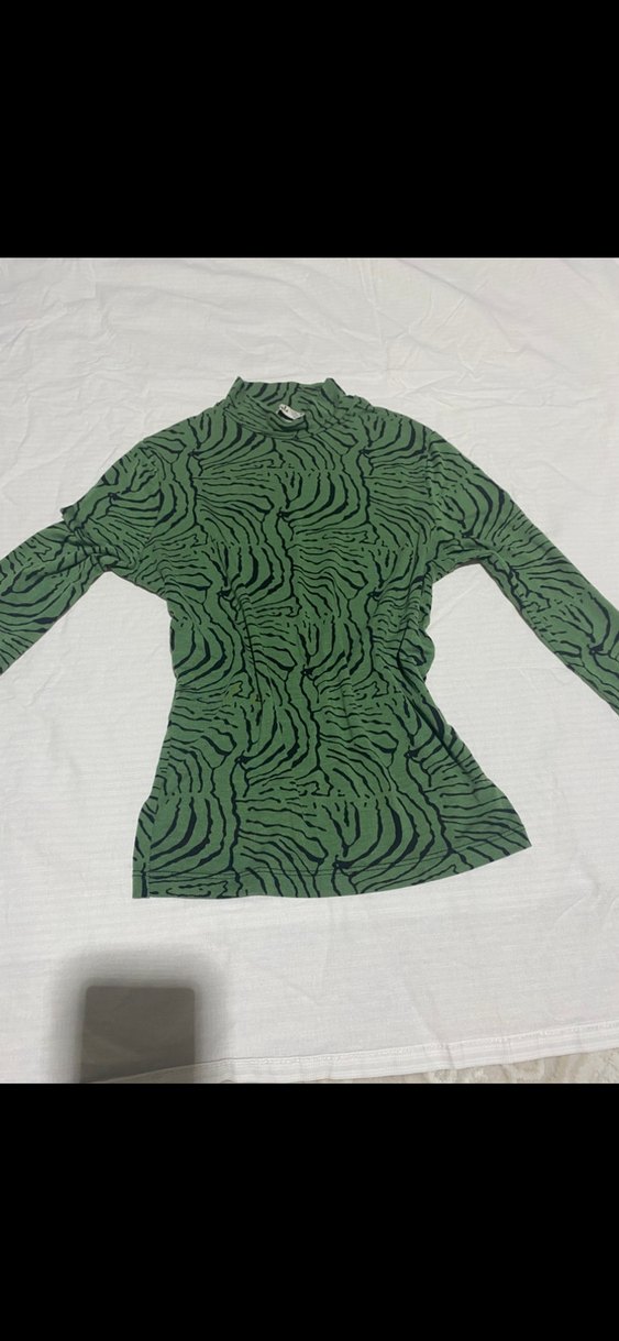 Yeşil zebra desenli, balıkçı yakalı ve uzun kollu, sentetik kumaştan örülmüş, vücuda oturan midi uzunlukta bir bluz. Günlük kullanıma uygundur.