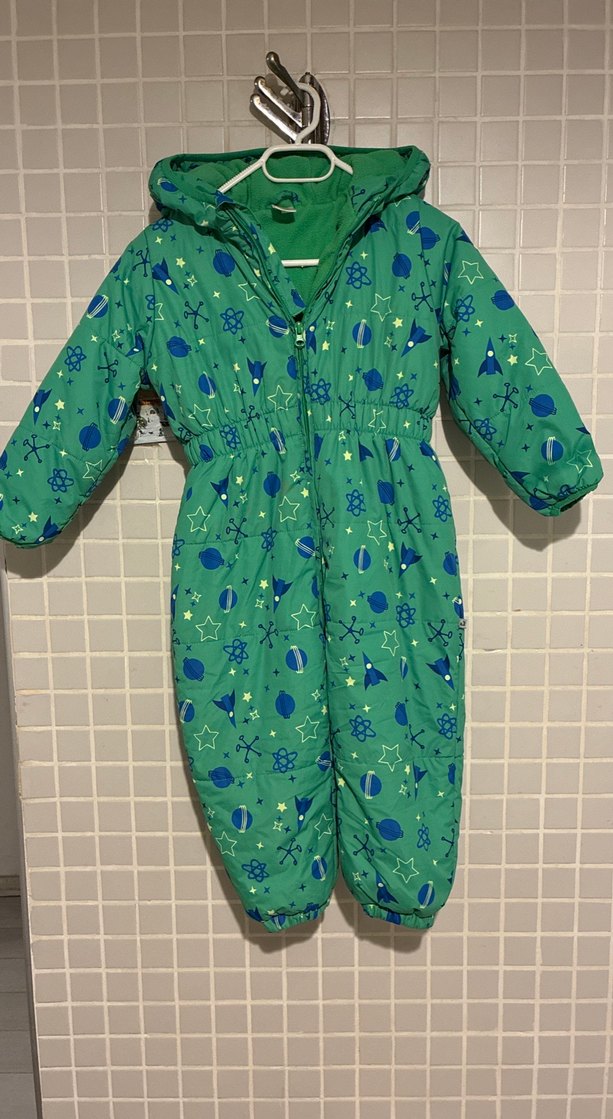 Yumuşak ve sıcak kumaşlı, kapüşonlu, düğmeli yeşil renkli bebek kayak tulumu, renkli uzay desenleriyle sokak stili için uygundur. ❄️uzay desenli içi polar EUR 98 boy 90 cm kol altı 42 cm