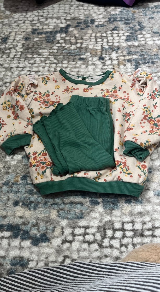 Uzun kollu, pastel renklerde çiçek desenli yumuşak örme kumaştan bebek kız takımı. Yeşil pantolon, konforlu ribana manşetlere sahiptir.