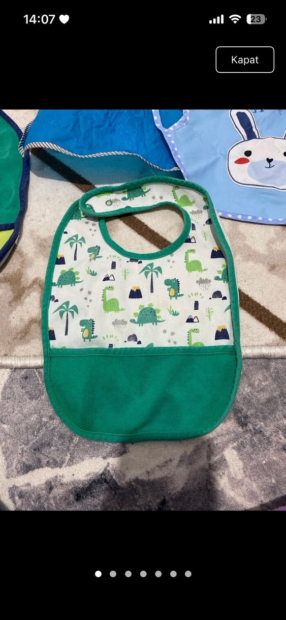 Yeşil ve gri tonlarında, dinozor desenli bebek önlüğü. Yumuşak kumaş ve döküntüleri yakalamak için cep içerir.