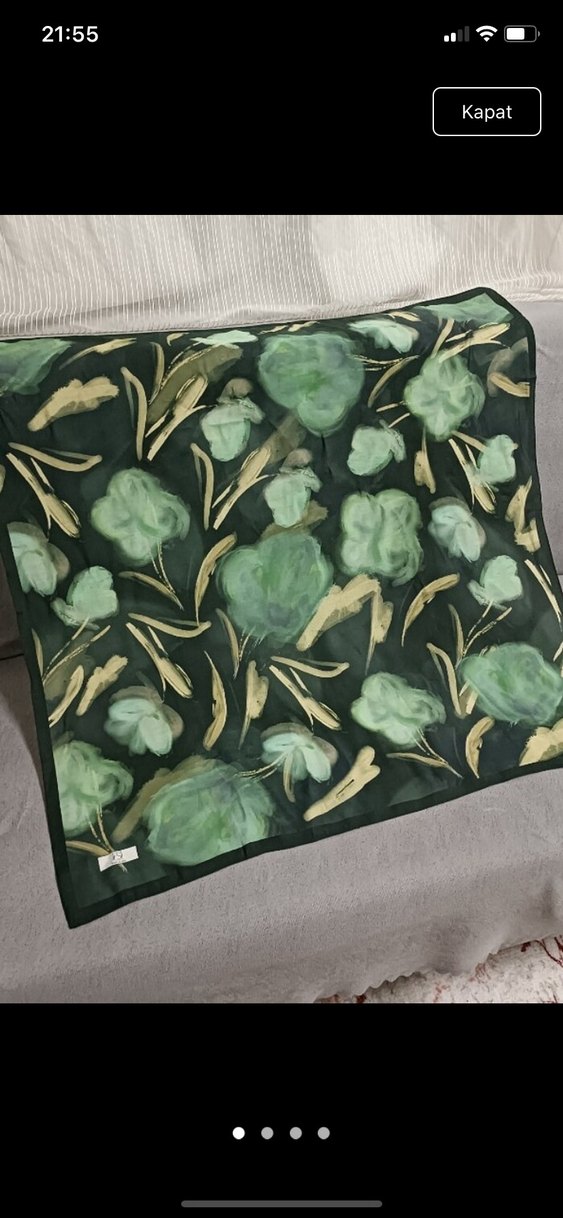 Koyu yeşil renkte, çiçek desenli ve drapeli bohem tarzda kadın eşarp. Yumuşak sentetik kumaştan üretilmiştir. Tertemiz az kullanılmıştır