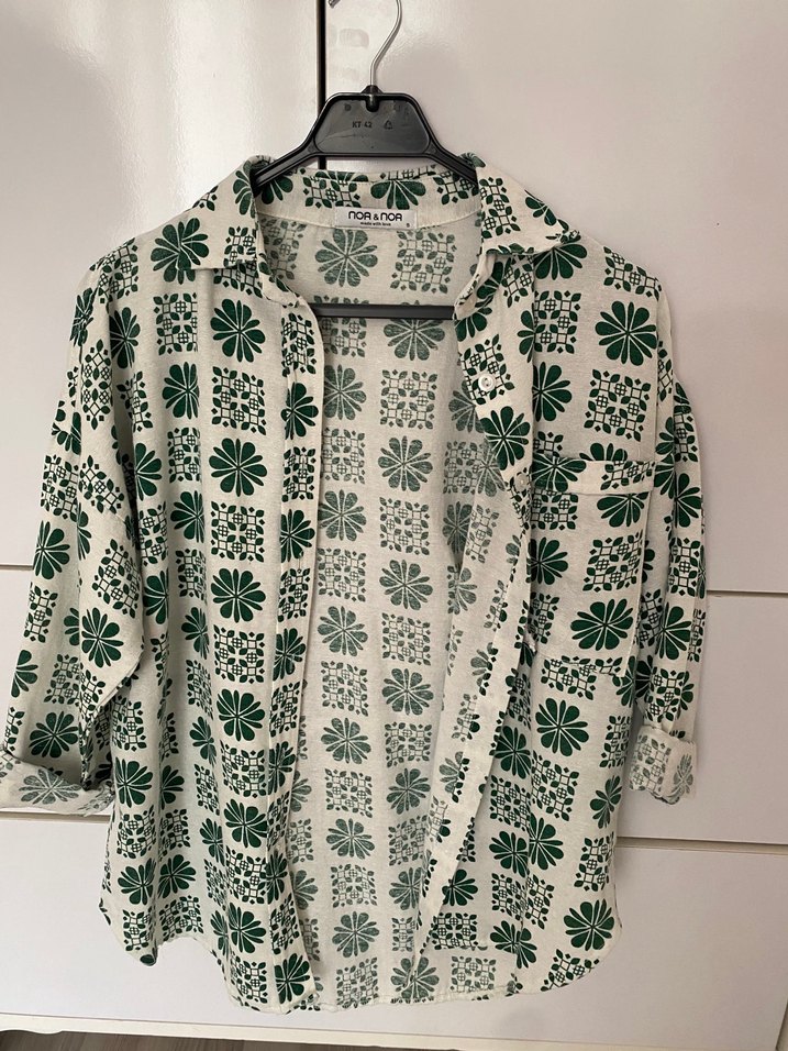 Düğmeli önü ve uzun kollu, yeşil desenli bohem stil kadın gömlek, çıkmalı yaka ve baskılı tekstil kumaştan yapılmıştır.