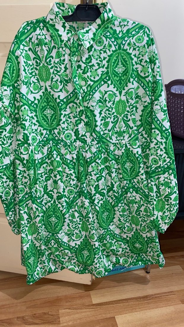 Yeşil desenli tunik, uzun kollu ve yüksek yakalıdır. Bol kesim, drapeli , beli lastikli balon bel ve parlak dokusuyla günlük kullanıma uygundur.