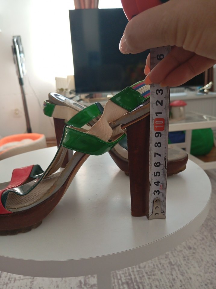 Yeşil desenli, tokalı bantlara sahip platform topuklu kadın ayakkabısı, sağlam kauçuk tabanlı ve retro bohem tarzı için uygundur. Topuk yüksekliği yaklaşık 10 cm. hiçbir kusuru yoktur