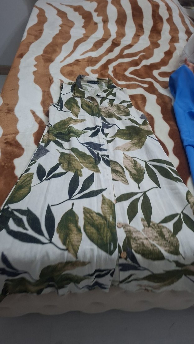 Yeşil yaprak desenli, kolsuz, V yakalı, bol kesim ve drapeli uzun elbise, hafif sentetik kumaştan bohem tarzda.