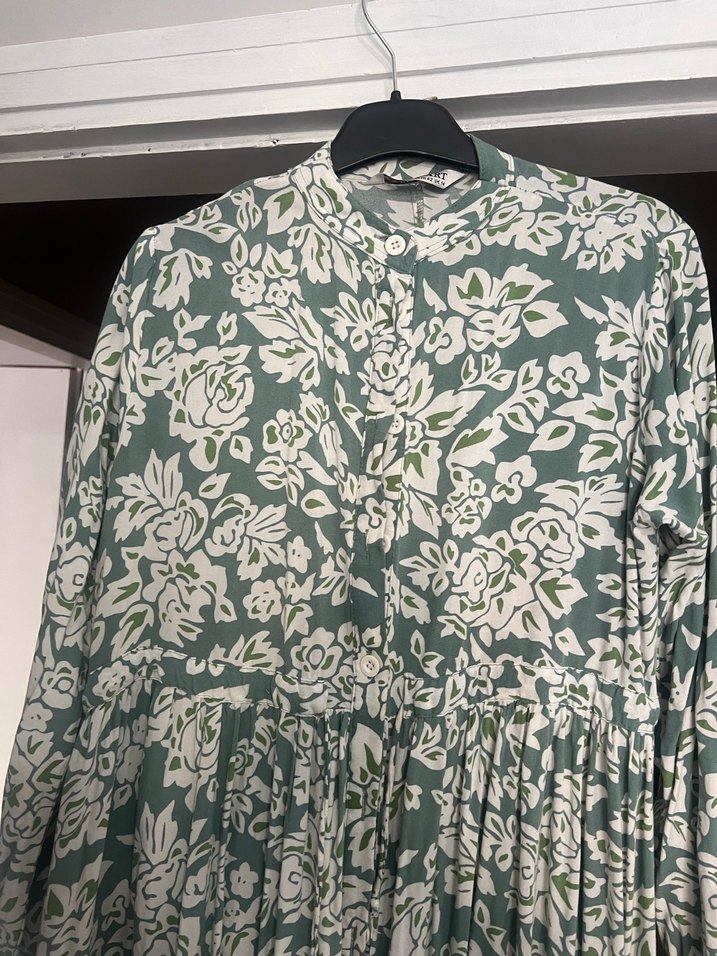 Yeşil renkte, yüksek yakalı ve uzun kollu, bol kesim uzun elbise. Sentetik kumaş üzerinde beyaz çiçek desenli ve pile detaylı, bohem tarzda bir modeldir. Hiçbir hasarı yok 2 kez giyildi 42-44 beden uygun
