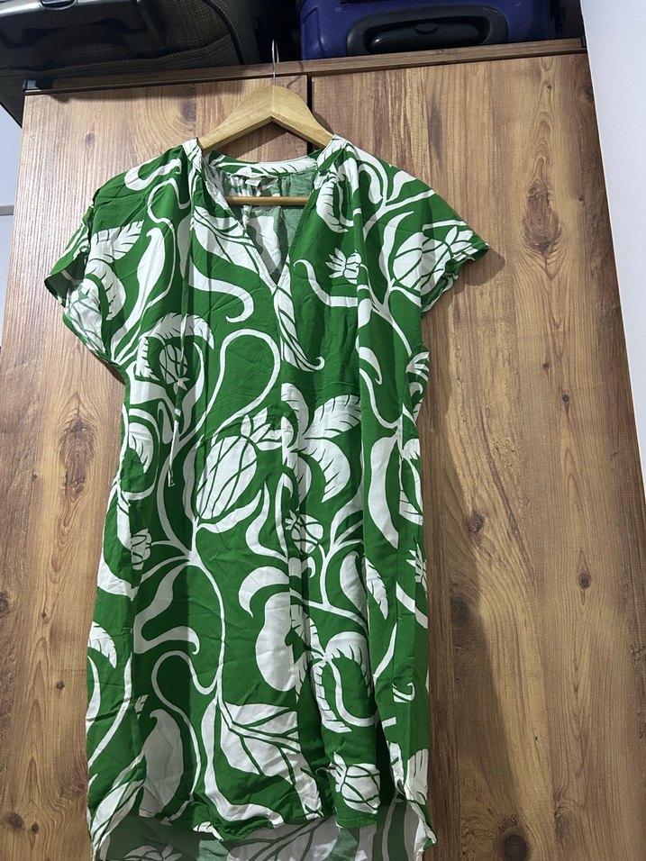 Yeşil renkli, renkli baskılı, V yakalı ve kısa kollu uzun elbise. Bol kesim ve drapeli tasarıma sahip, günlük kullanım için uygundur.