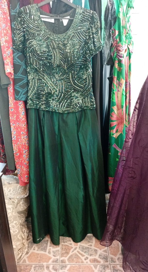 Yeşil renkli, desenli, drapeli ve bol kesim uzun elbise, kayık yaka ve kolsuz tasarımıyla bohem tarzını yansıtıyor.