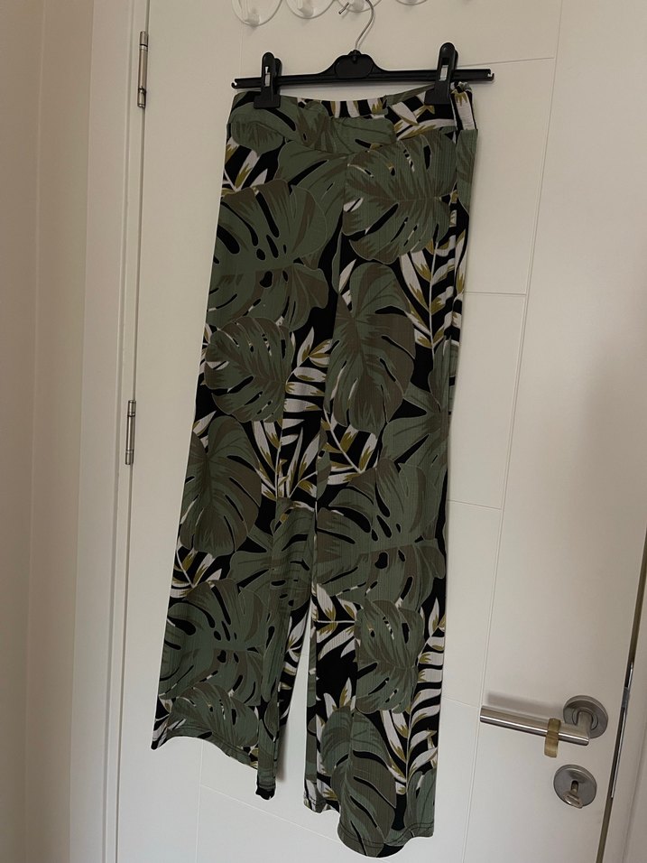 Uzun, bol kesim, yeşil desenli, pileli kadın kumaş pantolon. Sentetik kumaştan, bohem sokak stiline uygun, outdoor kullanıma ideal.