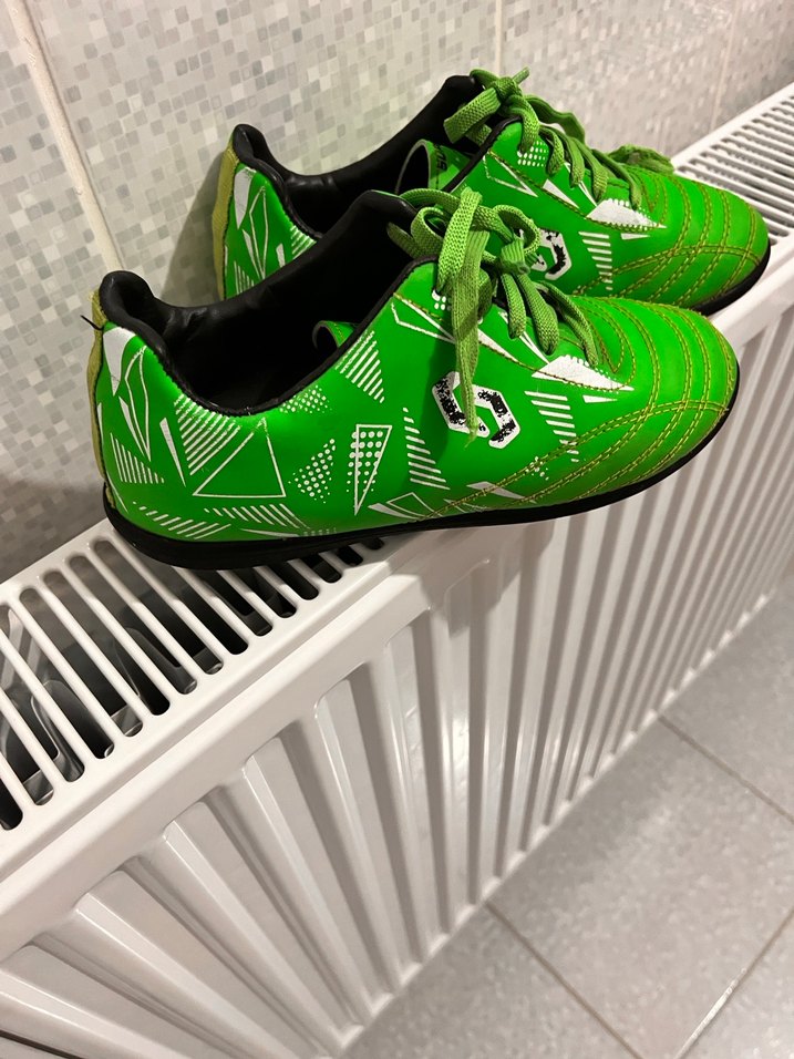 Canlı geometrik desenlere sahip yeşil erkek çocuk spor ayakkabısı, krampon