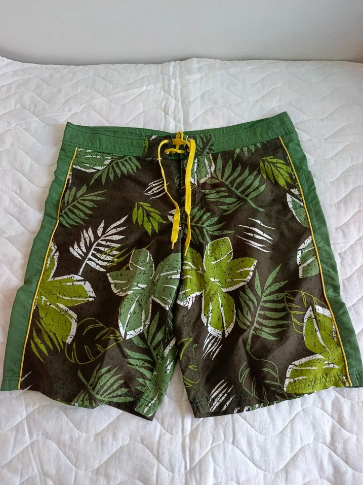 Yeşil tropikal yaprak desenli, kemerli bel ve bol kesim erkek mini deniz şortu. Plaj için uygun, bohem tarzda.